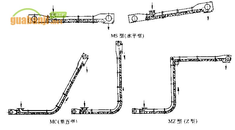 埋刮板輸送機(jī)產(chǎn)品常見(jiàn)型號(hào)及布置形式示意圖: