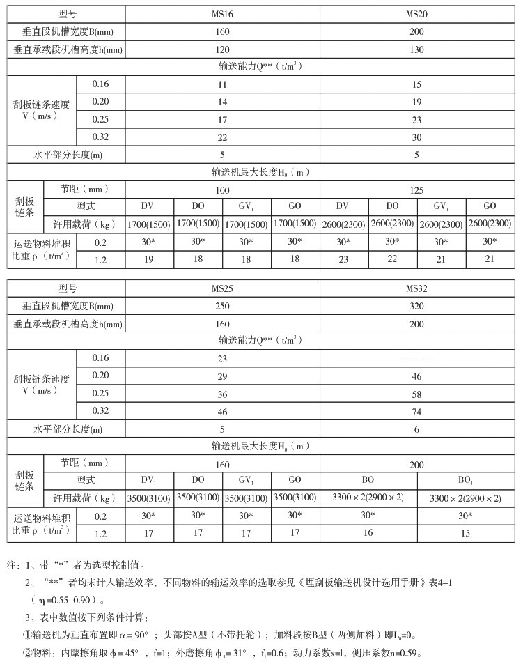 (一)MS型埋刮板輸送機技術性能表